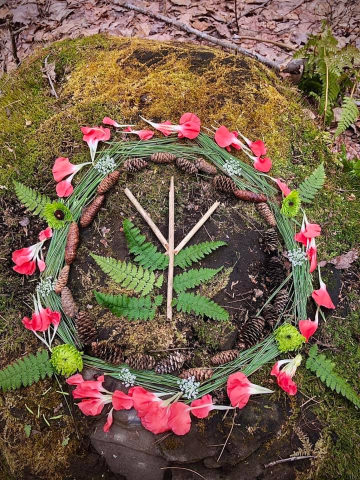 This nature shrine is of the Rune Algiz. Algiz is the rune of protection. I felt as though we all needed a little extra protection with this virus all around us. In fact, most people are now wearing protective “gear” when going out into the world including masks and gloves. Masks and gloves are good for physical protection. But what people often forget is the huge percentage of our lives that takes place in the unseen world. Our energy bodies need protection also, if not even more so. Some of the most valuable spiritual studies I have ever experienced have been about “psychic hygiene.” Having good psychic hygiene means having strong energetic boundaries, being aware of your intuition and only letting in what is healthy for you. It’s like being on an energetic “diet” if you will. Only we know what is good for us and makes us thrive, and what is draining to us and makes us sick. Just like some are allergic to wheat, maybe there is a certain energy that you are tempted by or drawn to that you know is destructive for you. It is your right and responsibility to protect yourself from that. Only you can invite things into your energy field, make sure you are doing it very consciously.