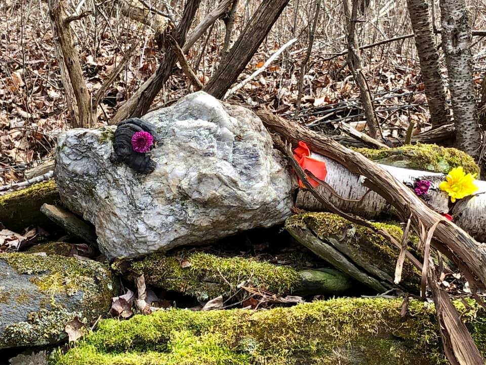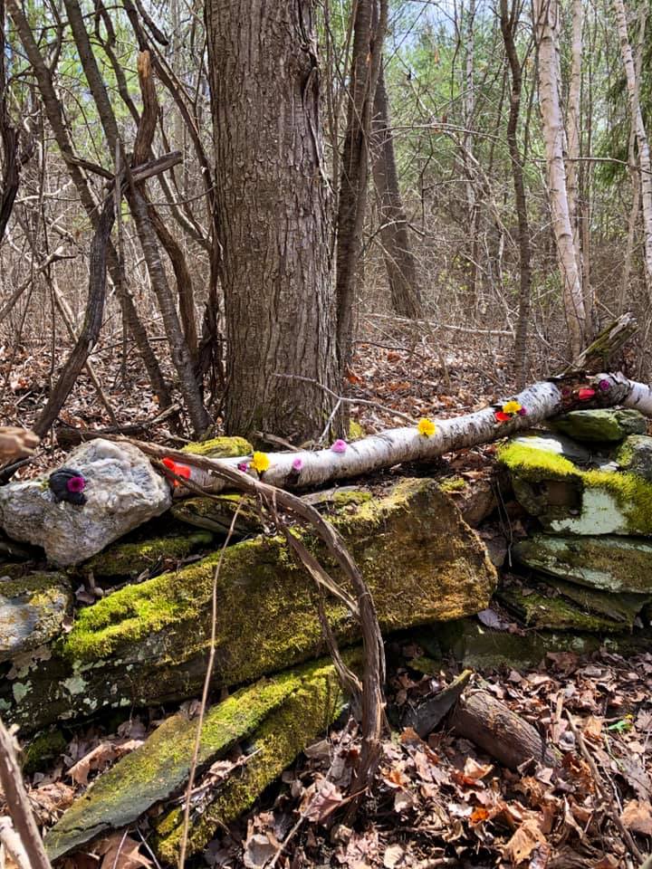 In the area I walk I had always seen this pile of mossy rocks, to me I felt like it was a dragon lounging there. When I woke up from my dream that morning I knew what I had to do! My nature shrine that day had to be making that dragon I sensed come to life. This was actually my largest shrine so far and I found myself moving fallen trees to outline her spine. I placed a quartz rock for her head. I adorned her with flowers. To me she was already there. I simply made her more visible, and gave her the much needed attention she deserved.