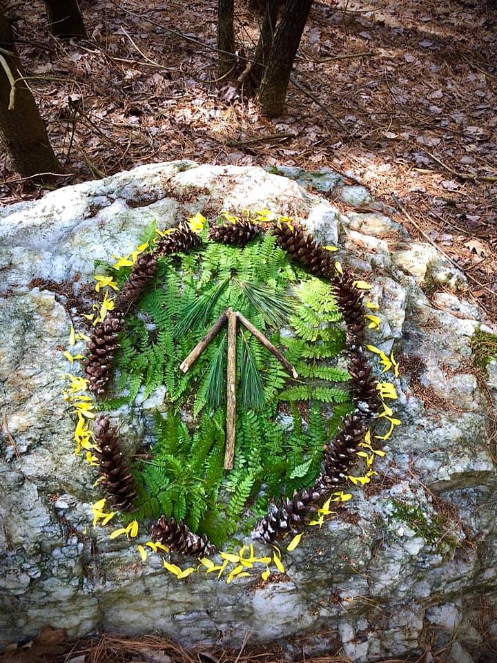I built this shrine in an area of the woods that I often have felt is a bit special and magical whenever I pass by it. It had some quartz crystals peeking out of the ground and the sun always shines through the trees to embrace them. The air feels different in this area. When I was building this shrine I felt as though there were something tangible in the space around me. The energy was different than the rest of the woods. But I couldn’t see anything with my naked eye, so I stepped back and took a picture. I think I did capture something in the photo! Because even if the sun coming through the trees made a rainbow, it wouldn’t explain the rainbows coming from other directions and all seeming to converge over my shrine.