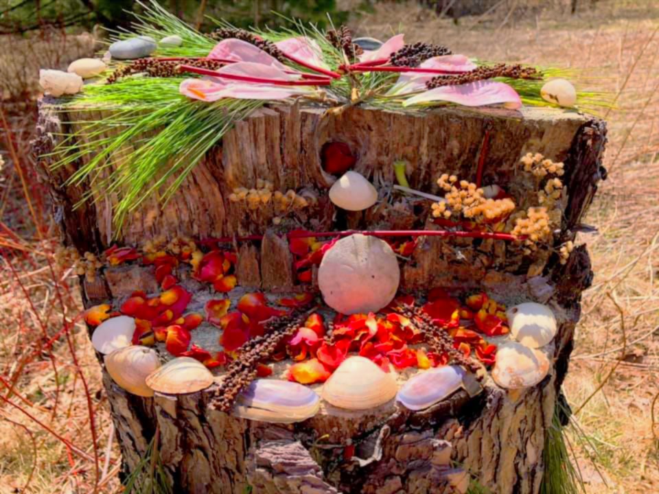 I wasn’t sure what I wanted to build about this day, but it was a nice sunny warm day for a change. As I walked along the path I felt pulled to go in a different direction than usual. I went up a path I had never tried before. I had learned to tune in and trust my instincts when out shrine building. I saw a tree stump where it looked like a tree had recently been cut down. It was out in the middle of a bright sunny open field. I knew this was where my shrine wanted to be! I went out there and quickly got to work enjoying the warmth of the sun on my back. I started singing a song about fire that the Druids often sing together while building a fire. I was blissfully unaware of what I was making or why I was singing about fire. It wasn’t until the shrine was built that I noticed how the dried rose petals looked like fire embers, and the triangle of light hitting the centre of them also could appear to be the shape and image of a fire. I would later remember Beltane, and how it roughly translates to “Bright Fire.” It was on this holiday that cattle would be led through the centre of two large fires to “bless” them for the coming year.