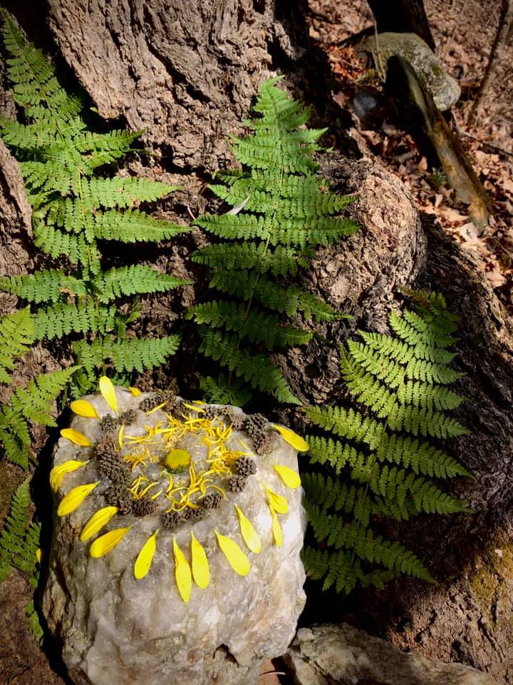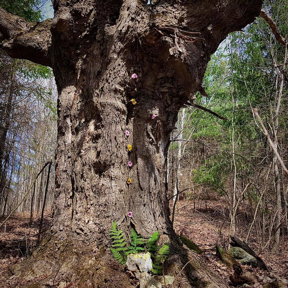 As I walked away that day I came to another path, where I saw the other “oldest” tree in the forest. This one felt more masculine to me. I remembered I had built a shrine dedicated to “him” a few weeks prior. It’s interesting how they are on different paths, yet seem to be on a straight path to each other. I imagine they are on the same ley line, or energetic path. As I walked through the invisible line that connected them I felt an energy , as if they were communicating with each other, as if they were long time friends and lovers. The Grandmother and Grandfather of this forest: the May King and Queen! Perhaps I had unconsciously “crowned” the King weeks earlier without knowing? It is interesting too, because his shrine was of the sun at his base and very much looked “crown like” as well.