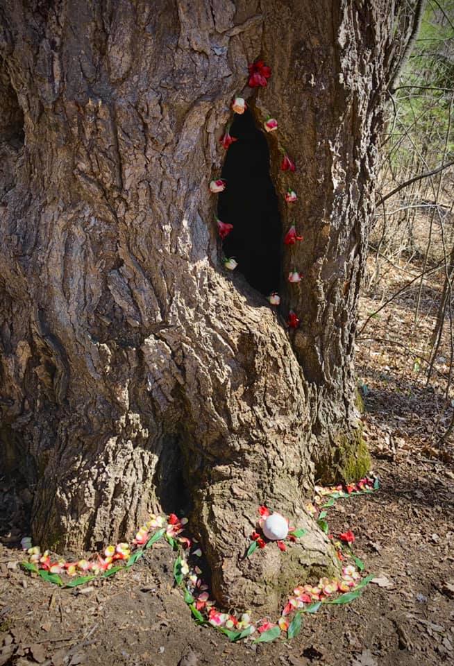 I wasn’t sure what to do with her. I tried hanging things in the opening of her trunk; wedging things in there, but nothing felt right. Next I tried stringing flowers together to outline the opening but that didn’t work either. Eventually I settled on pinning the flowers around the opening. But it didn’t seem like enough. I loved the way her large roots made wavy patterns on the ground. I thought it would be interesting to emphasize them somehow, so I started sprinkling flower petals along them, afterwards adding leaves in another “row” of colour. I really like the effect that gave! Finally, I finished by placing a large Welch shell on her front most root, it was as if it were the crowning jewel in her tiara. I think it was then that I realized I had crowned her the “May Queen.” Traditionally on May Day (Beltane) a May King and Queen are chosen. They play a leadership role in the community for the coming year. Later this same day I was on a Druid online ceremony (since we couldn’t meet in person due to Covid.) They were talking about choosing our next May King and Queen. But even more interesting was that they were suggesting, since we are all on our own, that we go out and “connect” with a tree, whatever that looked like to us. Here, I had done that already earlier that day!
