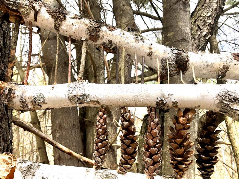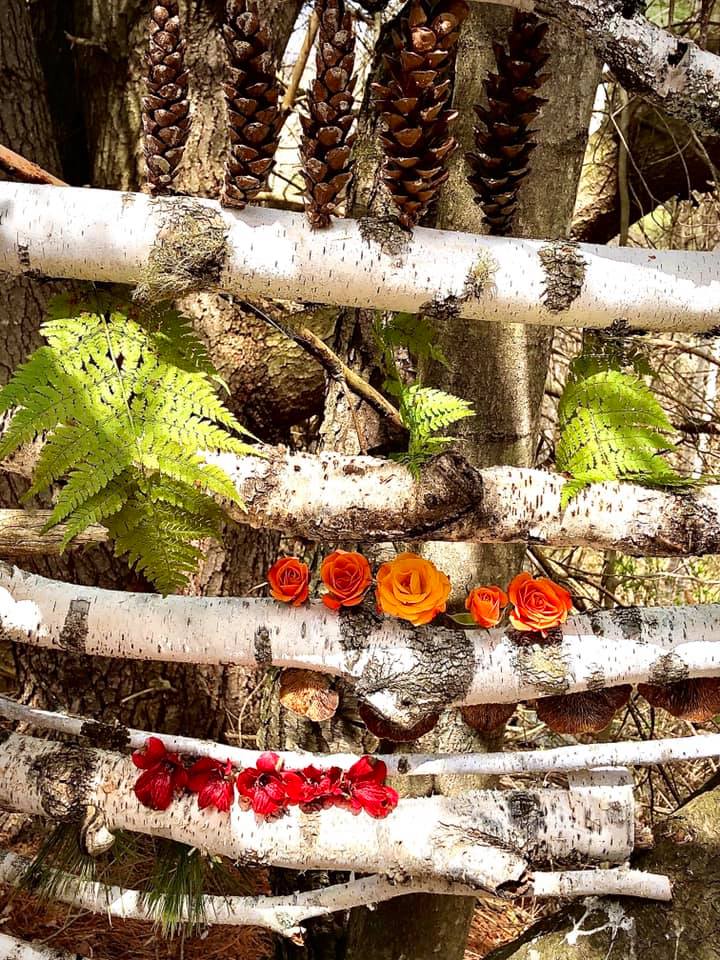 I was definitely thinking about Mother’s Day with today’s nature shrine. This was a balancing act to build! I can’t tell you how many times rows of items flew away, or a branch would fall and I’d have to start all over. In some ways it reminded me of the practice of patience and being a mother. I also like how some parts of it remind me of DNA structure. I was thinking about patterns in nature, patterns in our cells, and ancestry. Patterns being passed down and mutated through our genes. What have we inherited from our lineage? Which come naturally and which do we have to build upon and reinforce? Are there patterns we want to restructure? If so how do we go about doing so?
