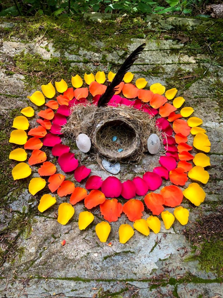 I had been wanting to do a second death ceremony when I reached that chapter again in my home study course. I went to Dreamland for an overnight and meditated on it. Dreamland is our sacred land where we do our Druid training here in Vermont. I was going to do it there on my own, in the woods. I build a nature shrine, as I’d been doing this past year, in the spot where I wanted to lay out overnight. A long, flat, human body sized/ shaped stone. The shrine I built there was profound in its symbolism. A friend had given me a bird’s nest with the remains of a sky-blue egg shell delicately laying in its center become the center of the mandala. The egg being the symbol of the Ovate cracked open and empty seemed to represent the transcendence, the culmination of Ovate work. To break the shell of that egg and burst out into the light. Into new life, with stretched wings, having spent the dark night of the soul in the safety and protective darkness of the mini womb for gestation. I placed in the center of the nest some mala beads from a mala I had used for prayer and mantra for many years that broke. It is said when a mala breaks its work is done. It is filled now with prayer and should be buried or thrown into a lake or somehow returned to the land. This particular mala I loved because it was made of colorful semi-precious multi colored stone beads. What better place to return them to the land but Dreamland? Also- they represented the years’ worth of spiritual practice I had done to get to this point. I also put a piece of my baby blanket into the nest and the ashes of a dear friend and lover I had lost. Again, filled with symbolism. Around the nest I put layers of rose petals of red orange and yellow to symbolize the funeral pyre from which the new spirit will emerge. After my over night there and this project, I somehow still didn’t know what to do for my death ceremony. But in the coming week I had sort of a “spontaneous” death ceremony on a hike up Spruce mountain. I had gone to the mountain by myself and wound up caught in a down pour at the top. I was most certainly in real life danger the entire way down and had some profound spiritual realizations. But that’s a story for another day.