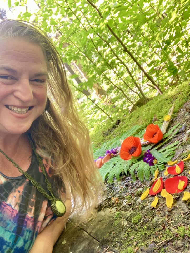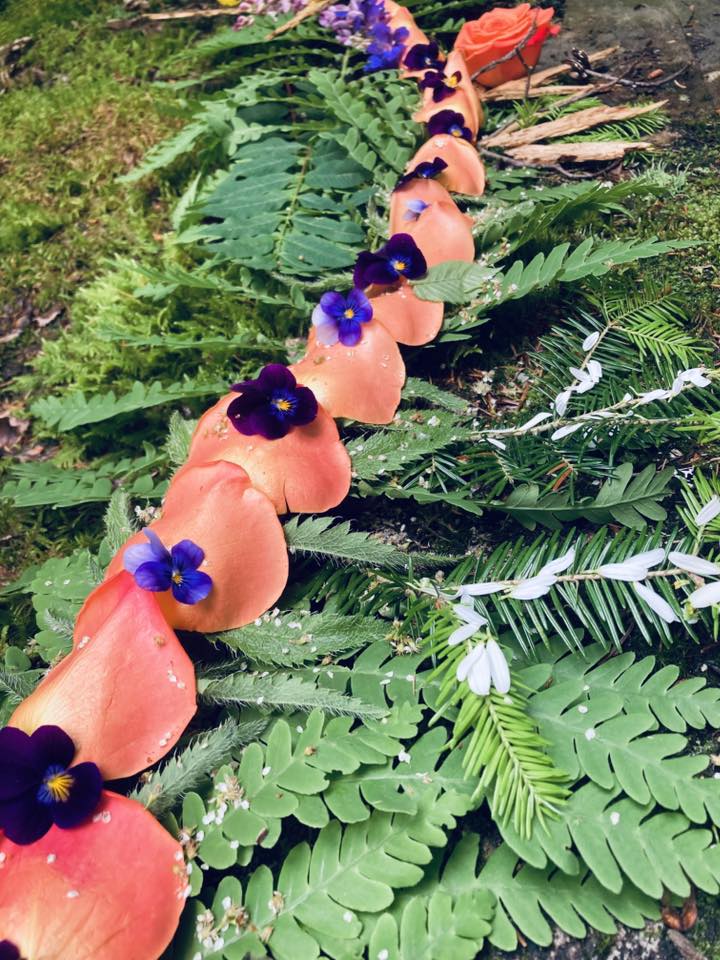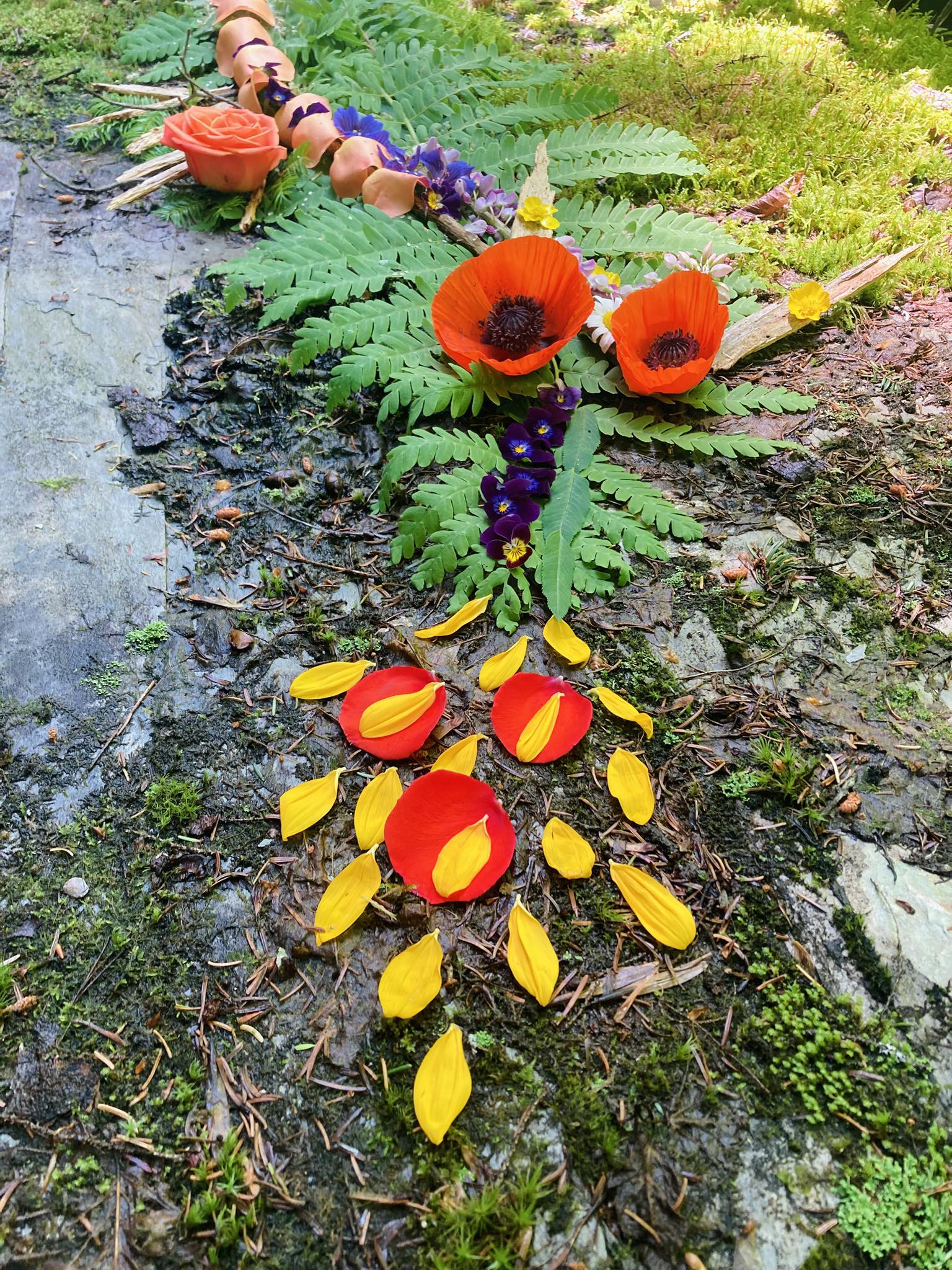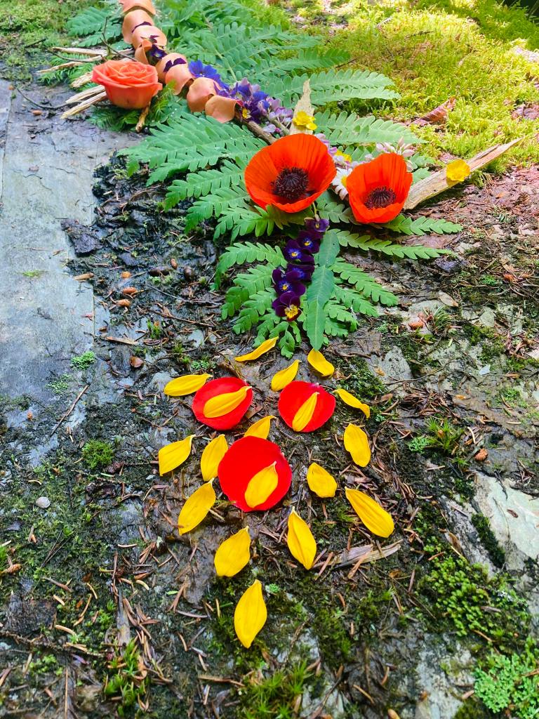This shrine took hours of pain staking work getting the rose petal spine of the Dragon just so. It was hot, humid, and the bugs swarmed. But I was determined to birth this Dragon! So, like a labor, I sweat and worked, and took breaks, and jumped back in again, until he was born. He is magnificent.
