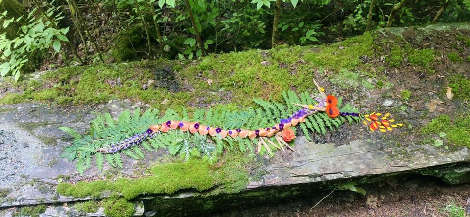 I have always had a strong relationship to Dragon. Born the year of the Dragon in the Chinese zodiac, as well as always having a feeling that dragon was around me “protecting” me. This year I took a big leap of faith, and strengthened my relationship to Dragon. While on sort of a “retreat” processing all this, I decided to head into the woods to build a nature shrine. As I walked along I thought about where I would build it? The image of this recumbent stone on the forest path I was on came to mind. I knew I wanted to build a Dragon. It suddenly dawned on me as I walked that this is the same spot I had built another mandala/ shrine about four years ago. It was a nest mandala. The center of which held a nest with a cracked egg shell in it. I chuckled thinking it was the Dragon’s egg and now he wants to be born on that same exact spot.