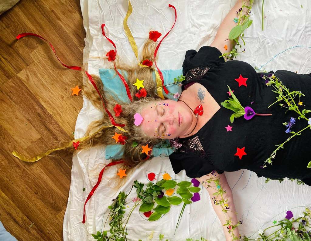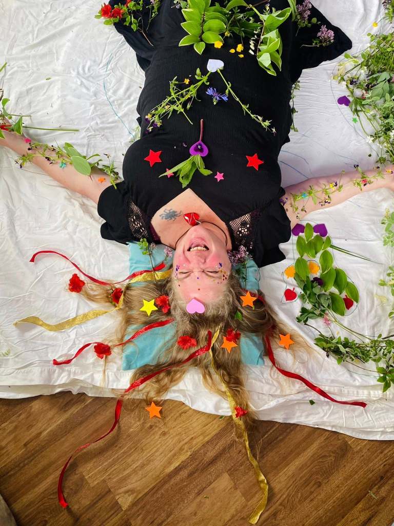 Back in May this year, a group of lovely female friends came over to my place to pamper me before a big ceremony I was having for myself the following weekend. Audrey, who was organizing the event, had a dream about putting me into one of the flower mandalas. The results were amazing! Since my event was related to Dragon, they made a Dragon next to me embracing me. You can see his head near mine, his wing, and his tail wrapping around my feet. I tried to be perfectly still while the ladies worked around me. It felt very peaceful, pampering. I went into a state of meditation. It smelled heavenly with all the flowers and green around me.